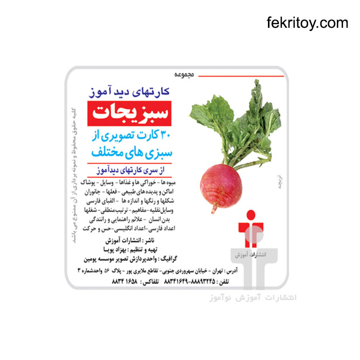 کمک آموزشی کارت دیدآموز سبزیجات شامل ۳۰ عدد فلش کارت است. فلش کارت های دید آموز برای کودکان ۱ سال به بال اطراحی شده است. به علت داشتن تنوع موضوعی زیاد، وسیله ای مناسب و مفید در تقویت حافظه دیداری و شنیداری به شمار می رود. این کارت های کمک آموزشی برای کودکان معمولی برای یادگیری موضوعات و مفاهیم متفاوت و تقویت حافظه آنها به کار می رود و در کودکانی که اختلالاتی دارند علاوه بر موارد فوق به صورت اختصاصی نیز مورد استفاده والدین و مربیان قرار می گیرد لذا برای بسیاری از مربیان گفتار درمانی پیشنهاد می شود.