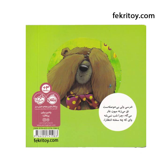 خرسی ولی بی حوصله ست نق می زنه میون غار می گه: «چرا شب نمی شه وای که چه سخته انتظار!» کتاب خرسی و صبر و انتظار را می توانید از سایت پرفسور کوچولو تهیه نمایید.
