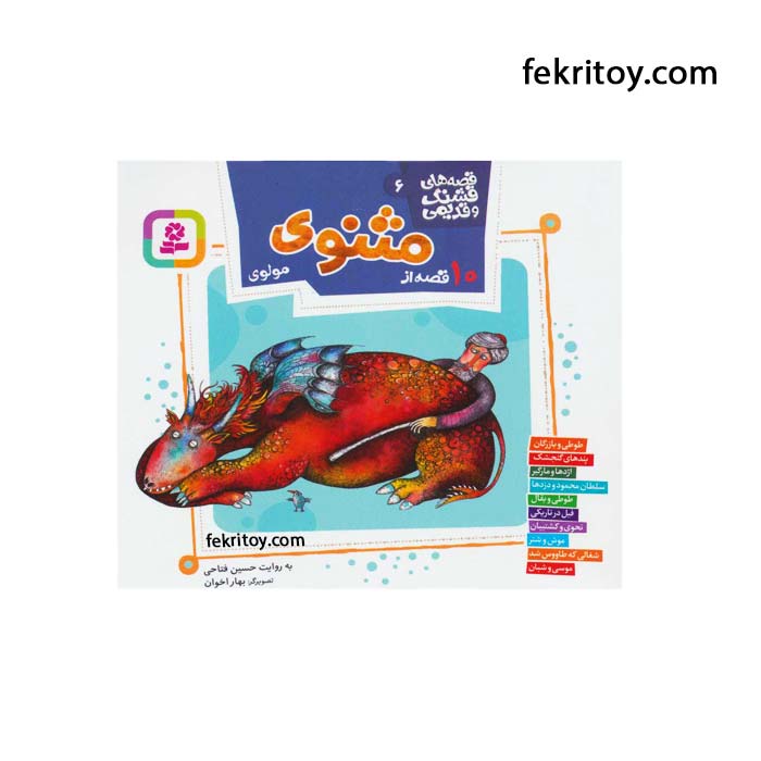 قصه هایی که در این کتاب آمده، از مثنوی انتخاب شده و به زبانی ساده برای کودکان بازآفرینی شده است. عناوین این کتاب عبارتند از: طوطی و بازرگان، پندهای گنجشک، اژدها و مارگیر، سلطان محمود و دزدها، طوطی و بقال، فیل در تاریکی، نحوی و کشتیبان، موش و شتر، شغالی که طاووس شد و موسی و شبان. کتاب 10 قصه از مثنوی/قدیمی6 را می توانید از سایت پرفسور کوچولو تهیه نمایید.