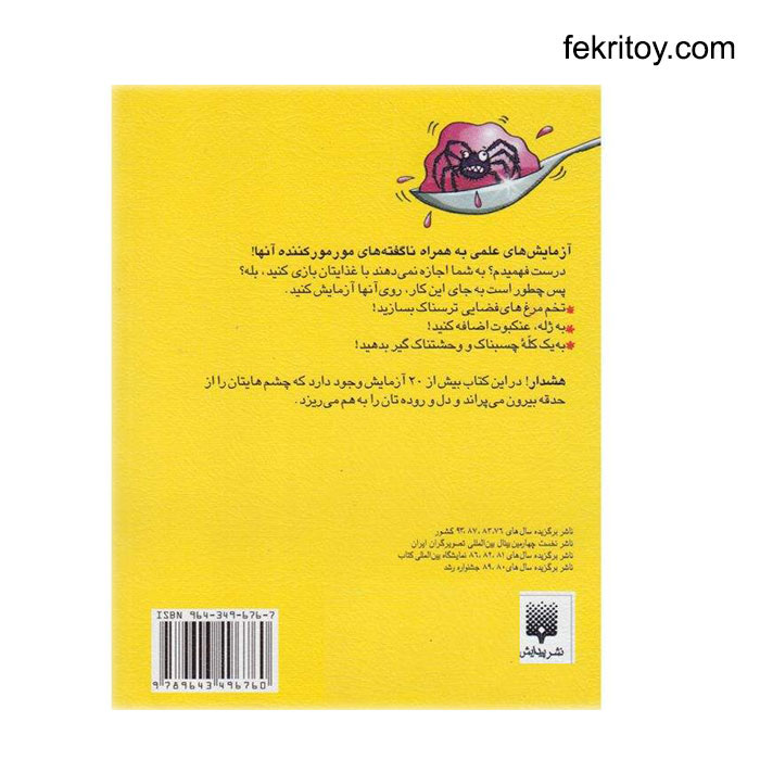 هشدار! در این کتاب بیش از 20 آزمایش وجود دارد که چشمهایتان را از حدقه بیرون میپراند و دل و رودهتان را به هم میریزد. کتاب علوم ترسناک/آزمایش های شلم شوربا را می توانید از سایت پرفسور کوچولو تهیه نمایید.