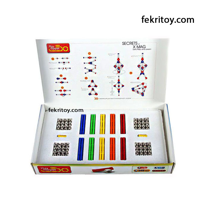 مگ مغناطیسی 248 قطعه شامل قطعات آهنربایی در رنگ آمیزی شاد و درخشان است. کودک باید به کمک قدرت تخیلات خودش اشکال و سازه های هندسی مختلفی بسازد. با کنار هم چیدن قطعات به دلیل خاصیت مغناطیسی که دارند قطعات بخوبی بهم می چسبند و می توان اشکال دو بعدی و سه بعدی متفاوتی را ساخت. این اسباب بازی بی انتها است یعنی مدلسازیی که کودک انجام می دهد برگرفته از قدرت خلاقیت بی انتها است.