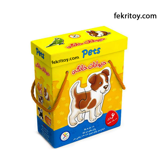 پازل جعبه ای حیوانات خانگی شامل ۶ پازل دو قطعه ای است که در زیر هر دو قطعه، طرحی کمرنگ از حیوانات خانگی نظیر: بز، گاو، اسب، الاغ، مرغ و گوسفند وجود دارد که به کودکان در چیدن پازل ها کمک می کند.