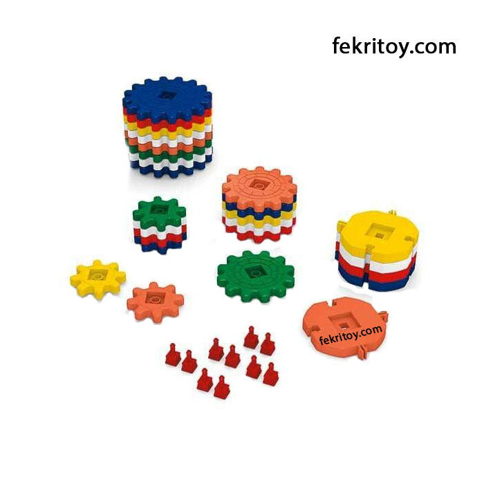 محتویات این بسته شامل ۴۵ قطعه پلاستیکی از جمله ۱۱چرخ دنده، ۱۱پایه، اتصالات، اِلمان سه بعدی حیوانات و انسان (دختر و پسر بازیگوش) که در یک بسته مقوایی زیبا با رنگ بندی جذاب برای کودک شما طراحی شده است.